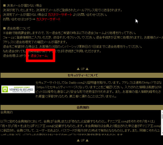 マニア王は「自動更新契約」になっています。退会は3分程度で簡単に終わります。
